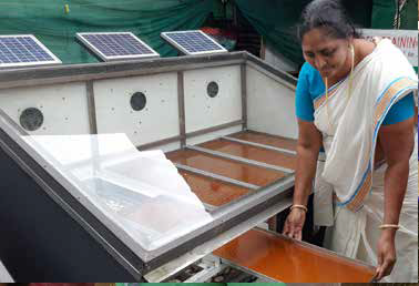 India produces large quantities of fruits and vegetables, but more than 50% of this is wasted. The project aims to: 1) demonstrate the commercial viability of solar drying of fruits, vegetables and condiments, and convert them into profitable products on a micro enterprise scale; 2) equip rural poor women with solar dryers and train them on proper use. Sthree Sakthi Mahila Samajam installed solar powered air dryers in 2017 under the Socio-Economic Program of AIWC. The technology of dehydration gave several benefits such as minimizing food waste and facilitating higher income to rural women. Cereal grains, vegetables, fruits, etc., can be dried in solar dryers under clean conditions in reasonably short time.
